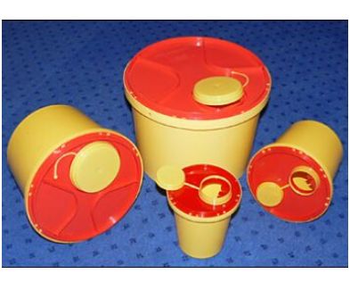 Pojemnik plastikowy na zużyty sprzęt medyczny (np. wenflony, strzykawki, igły, opatrunki). Wieko pojemnika jest zatrzaskowe. W wieku pojemnika znajduje się profilowany otwór wrzutowy. Parametry: 1. materiał: plastik. 2. pojemność (L): 05-07, 1, 2, 5, 11 3. wieczko z zaślepką TAK.