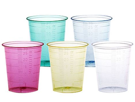 Kieliszki do leków jednorazowego użytku, plastikowe o pojemności 30 ml z podziałką. Kieliszki kolorowe pakowane są po 80 sztuk, kieliszki naturalne są pakowane po 75 sztuk.