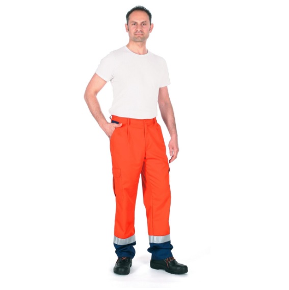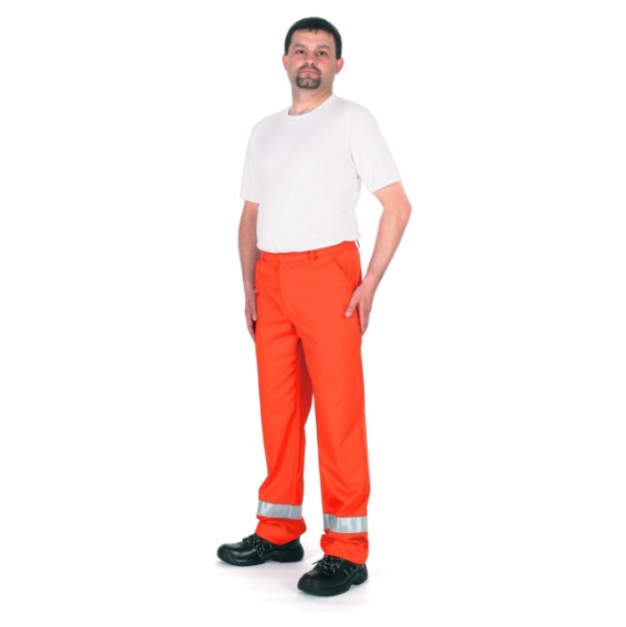 • z kieszeniami skośnymi z przodu, karczkiem odcinanym z tyłu i jedną taśmą odblaskową w dole nogawek.