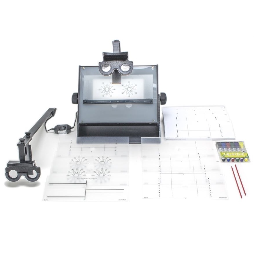 Oświetlenie tła z możliwością zmiany intensywności pozwala na zastosowanie zarówno przezroczystych, jak i nieprzezroczystych obrazków. Dwa boczne pokrętła umożliwiają zmianę pochylenia urządzenia w celu dostosowania jego kąta do prawidłowej postawy pacjenta. Wykalibrowana skala pod oknem podświetlarki służy do podtrzymywania obrazków, jak też pozwala na łatwe obliczenie działania pryzmatycznego przy różnych poziomach akomodacji. W komplecie dwie różne podpórki na czoło - do treningu dali i bliży.