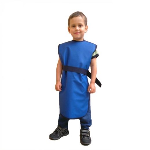 Fartuch dziecięcy. Fartuchy jednostronne występują w dwóch kategoriach: lekkie – 0,25 mm Pb na całej powierzchni; ciężkie – 0,35 lub 0,5 mm Pb z przodu i 0,25 na pozostałych częściach. Wymiary: mały - 50 cm długości; średni - 60 cm długości; duży - 70 cm dłuosci.