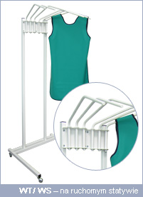 Wieszak z trzema lub sześcioma obrotowymi ramionami na ruchomym statywie (typ WS), wykonanym ze stali, pokryty białym lakierem proszkowym, pozwala na bezpieczne przechowywanie fartuchów w dowolnym miejscu na małej przestrzeni.