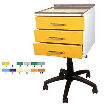 Asystor stomatologiczny - trzy szufladowy o wymiarach 45cm x 45cm oraz wysokość 75 do 90 cm. Wysokość asystora regulowana sprężyną gazową. Standardowo montowana jest noga w kolorze szarym lub czarnym (do wyboru). Wykończenie obrzeży specjalnym tworzywem zapewniającym dużą trwałość oraz solidność. Masa 30kg. Szuflady asystora są puste, w kolorze białym. Istnieje jednak możliwość dokupienia wkładek plastikowych, oraz górnej tacy metalowej.
