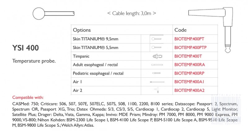 CASMed: 750; Criticare: 506, 507, 507E, 507ELC, 507S, 508, 1100, 2200, 8100 series; Datascope: Passport 2, Spectrum, Spectrum OR, Passport XG, Trio; Datex Ohmeda: S/3, CS/3, S/5, Cardiocap 1, Cardiocap 2, Cardiocap 5, Light Monitor, Satellite Plus; Drager: Delta, Vista, Gamma, Kappa; Invivo: MDE Prism; Mindray: PM 7000, PM 8000, PM 9000 Express, PM 9000, VS-800; Nihon Kohden: BSM-2300 Life Scope I, BSM-4100 Life Scope P, BSM-5100 Life Scope A, BSM-9510 Life Scope M, BSM-9800 Life Scope S.; Welch Allyn: Atlas