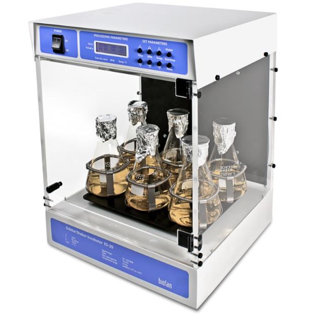 Wytrząsarka orbitalna z inkubacją ES-20 jest kompaktowym nastołowym urządzeniem używanym do mieszania płynów biologicznych, jak również do inkubacji i hodowli płynów biologicznych zgodnie z ustawionym przez użytkownika programem pracy. Wbudowany mikroprocesor zapewnia stałą kontrolę temperatury w komorze inkubatora. Wymuszenie cyrkulacji ogrzanego powietrza w komorze z przezroczystego pleksiglassu gwarantuje równomierny rozkład temperatury. Demontowalna konstrukcja ułatwia transportowanie urządzenia. Wytrząsanie orbitalne jest kontrolowane przez cyfrowy obrotomierz oraz cyfrowo ustawiony czas pracy niezależnie od temperatury. Urządzenie wyposażone jest w system bezpośredniego napędu zapewniając stabilną pracę w czasie prowadzenia długotrwałych hodowli (do 30 dni/nocy).