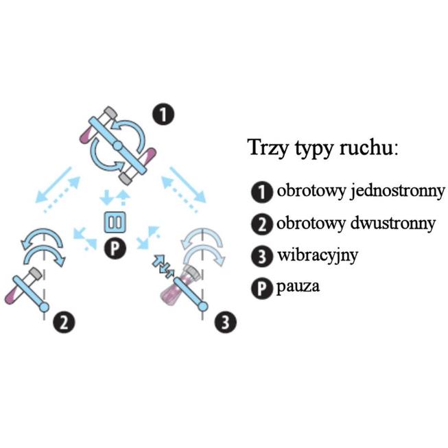 Programowalny rotator Multi RS-60 wykonuje różne typy ruchu w jednym urządzeniu. Kontrola mikroprocesorowa pozawala wykonywać nie tylko ruch rotacyjny (1) platformy, ale również rotacyjny zwrotny (2), jak również wibracyjny (3). Te trzy typy rychu mogą być wykonywane oddzielnie, jako połączenie dwóch ruchów i w cyklach, czasowo powtarzane w sekwencjach wszystkich trzech typach. Multi rotator znacznie rozszerza możliwości i zwiększa wydajność przygotowania próbek badanych materiałów i pozwala na regulację procedur mieszania według poszczególnych zadań.