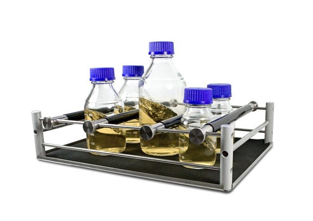 Platforma uniwersalna UP-300 z uchwytami na różne typy szkła laboratoryjnego, dostępne dwa poziomy uchwytów do wytrząsarki PSU-20i