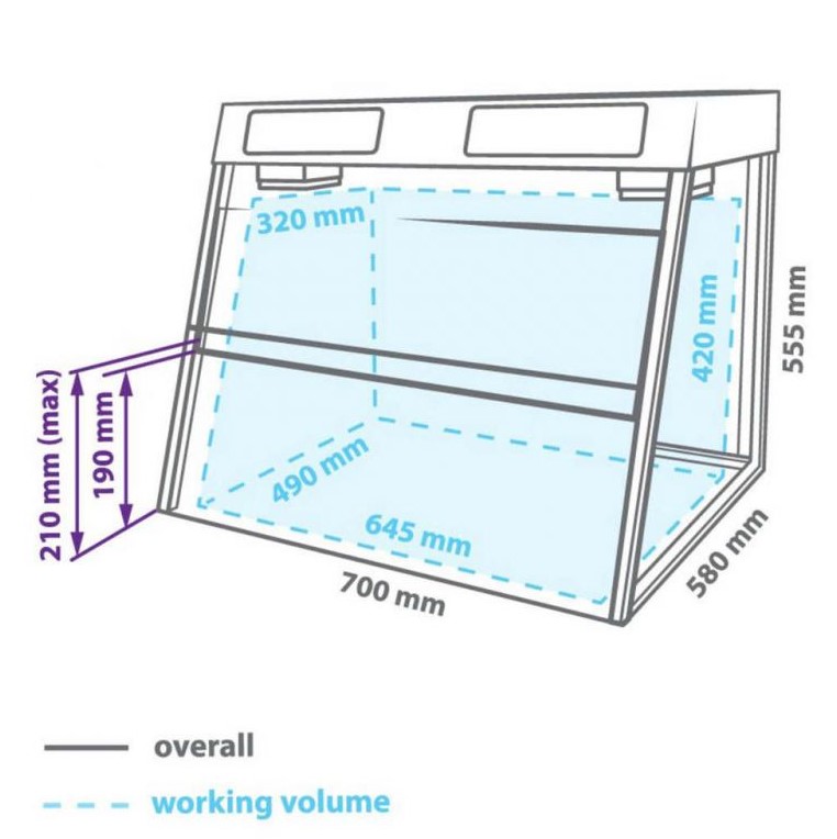 Komora jest wyposażona w otwartą lampę UV zainstalowaną w górnej części komory. Promieniowanie UV z otwartej lampy dezynfekuje powierzchnię roboczą dezaktywując fragmenty DNA/RNA w ciągu 15-30 min ekspozycji. Cyfrowy timer kontroluje czas naświetlania. Lampa światła białego zapewnia właściwe oświetlenie powierzchni roboczej.
