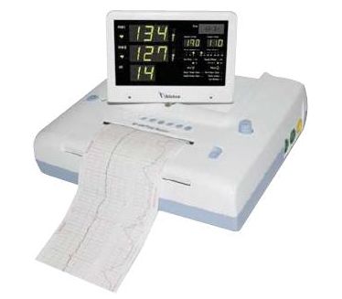 Aparat KTG z cyfrowym wyświetlaczem LED gotowy do monitorowania ciąży bliźniaczej.