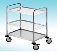 Stolik transportowy wykonany ze stali kwasoodpornej, profil rurowy, blat profilowany, 4 skrętne kółka o średnicy 125 mm.