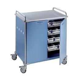 Wózek modułowy z kuwetami na leki. Wyposażenie: podwójne drzwi, 8 kuwet na leki. Wymiary: 1010x690x1085 mm.