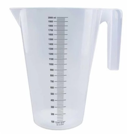 Naczynie miarowe o pojemności 2000 ml ze skalą do odmierzania produktów płynnych i sypkich.