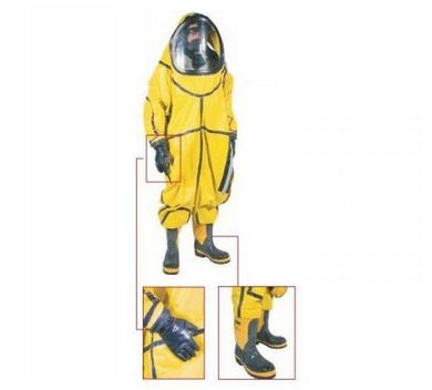 - Z kombinezonem zintegrowane są wymienne butylowe rękawice ochronne i buty typu strażackiego (buty posiadają stalowe wkładki w podeszwach wzmacniane noski oraz antypoślizgowe podeszwy, są odporne na chemikalia) W tylnej części kaptura znajdują się dwa zawory wylotowe do odprowadzania zużytego powietrza, stanowiące jednocześnie element systemu wentylacji kombinezonu.