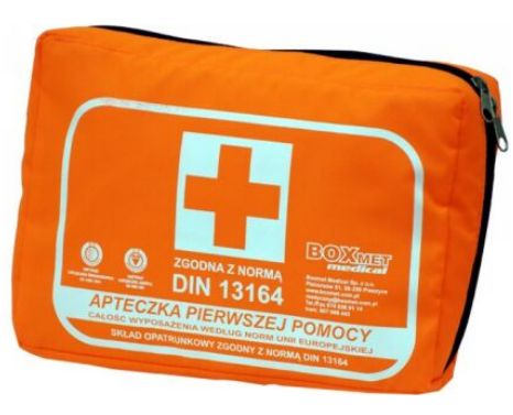 Apteczka samochodowa w formie torby poliestrowej o wymiarach 25x18x8 cm z rzepem umożliwiającym zamocowanie w bagażniku samochodowym. Wyposażenie zgodne z normą DIN 16164, w którego skład wchodzi: opatrunek indywidualny A z gazy opatrunkowej (1 szt.) opatrunek - bandaż 10cmx4m Matovis (3 szt.) plaster z opatrunkiem 10x6cm Prestovis Plus (8 szt.) plaster Polovis Plus 2,5cmx5m (1 szt.) opaska elastyczna 8cm Matoban (3 szt.) opaska elastyczna 6cm Matoban (2 szt.) gaza opatrunkowa jałowa 1/2m2 Matopat (2 szt.) gaza opatrunkowa jałowa 1m2 Matopat (1 szt.) kompresy z gazy jałowe 9x9cm, Matocomp (3 szt.) chusta trójkatna niejałowa (2 szt.) nożyczki DIN apteczne wygięte 14,5cm (1 szt.) rękawiczki lateksowe Ambulex (4 szt.) koc ratunkowy 160x210cm (1 szt.) worek foliowy (1 szt.) instrukcja pierwszej pomocy (mała składana).