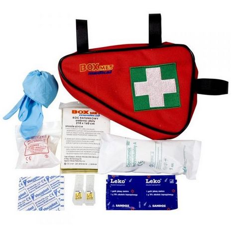 Apteczka rowerowa powinna być obowiązkowym elementem wyposażenia każdego rowerzysty, który nie tylko jest narażony na różnego rodzaju kontuzje, otarcia i skaleczenia, ale także, jako uczestnik ruchu drogowego, może być świadkiem lub ofiarą wypadku. Apteczka została umieszczona w poręcznej saszetce, którą można przymocować do roweru za pomocą pasków. Saszetka jest wodoodporna, dzięki czemu jej zawartość nie przemoknie pod wpływem deszczu. Jest dostępna w dwóch wersjach: mniejszej - trójkątnej oraz większej – prostokątnej, rozkładanej.