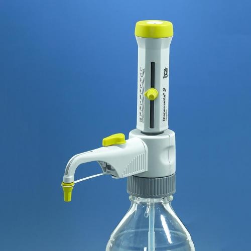 Dozownik butelkowy Dispensette ® S, certyfikat jakości i znak DE-M, teleskopową rurkę napełniającą, zawór recyrkulacyjny (opcja), narzędzie do montowania i adaptery z PP. Kolor kodowy - żółty. Doskonałe do dozowania rozpuszczalników organicznych np. chlorowanych i fluorowanych węglowodorów takich jak chlorek metylenu czy trichlorotrifluoroetan, a także stężonych kwasów takich jak HCl lub HNO3 (ale już nie HF) czy kwas trifluorooctowy (TFA), a ponadto tetrahydrofuranu (THF) czy też nadtlenków.