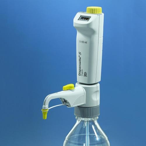 Dozownik butelkowy Dispensette ® S, certyfikat jakości i znak DE-M, teleskopową rurkę napełniającą, zawór recyrkulacyjny (opcja), narzędzie do montowania i adaptery z PP. Kolor kodowy - żółty. Aplikacje analogiczne jak Dispensette ® Organic Analog S. Wyjątkowo wyraźny odczyt cyfrowy.