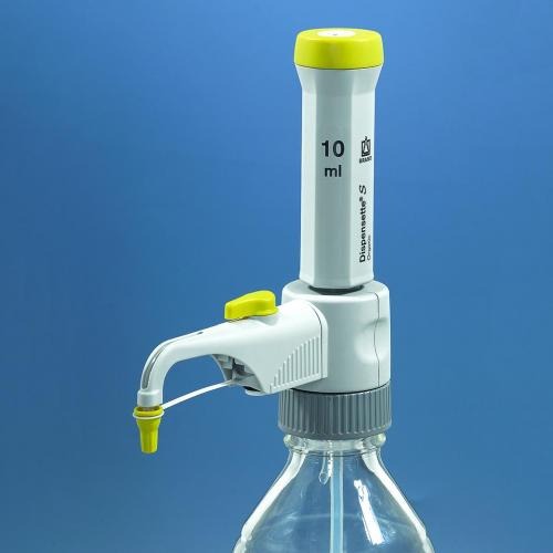 Dozownik butelkowy Dispensette ® S, certyfikat jakości i znak DE-M, teleskopową rurkę napełniającą, zawór recyrkulacyjny (opcja), narzędzie do montowania i adaptery z PP. Kolor kodowy - żółty. Aplikacje analogiczne jak Dispensette ® Organic Analog S. Dozowniki o innych stałych objętościach są dostępne na życzenie.