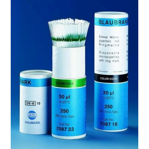 BLAUBRAND®. Zgodne z normą DIN ISO 7550. Oznaczenie DE-M dla pojemności 5 pL i większych. Zgodne z niemieckimi przepisami legalizacyjnymi. Wzorcowanie na wlew (TC, IN). Kodowanie kolorami, zgodne z normami ISO ułatwiające identyfikację.