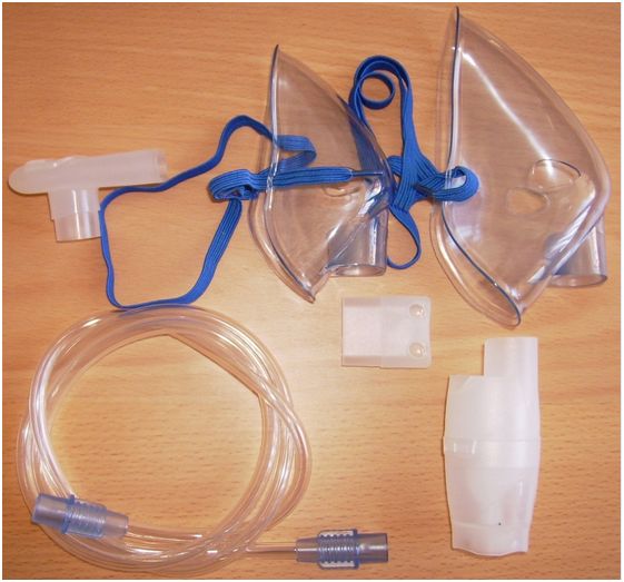 Zestaw akcesoriów HI-FLO do inhalatora pneumatycznego: nebulizator, maska dla dorosłych, maska dla dzieci, ustnik, wężyk.