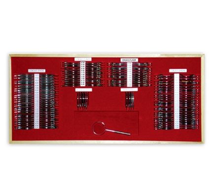 Zestaw szkieł probierczych w eleganckiej walizce z możliwością wyjmowania drewnianej wyściełanej kasetki. Szkła w oprawach metalowych-srebrnych, wąskich przystosowanych do perymetrii.