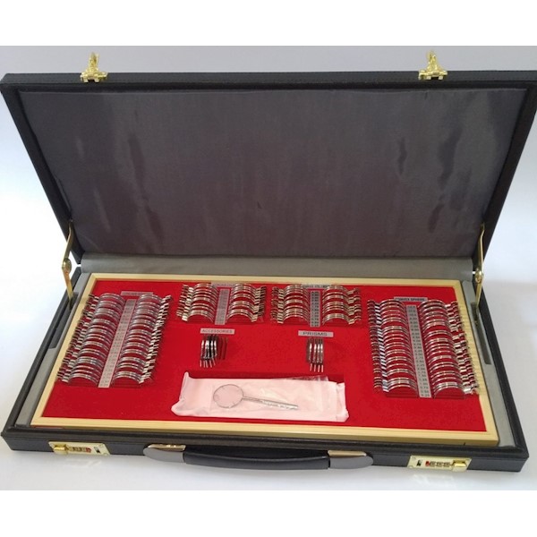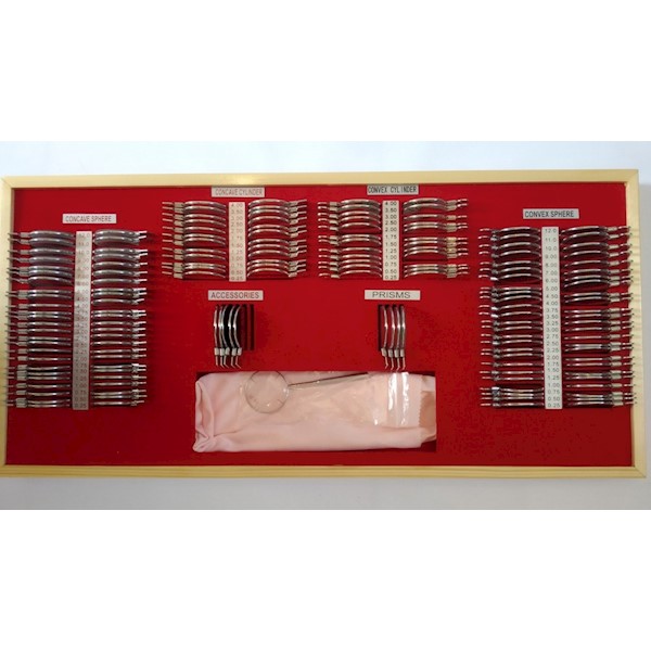 Szkła w oprawach metalowych-srebrnych, wąskich przystosowanych do perymetrii. Średnica szkła - 38 mm.