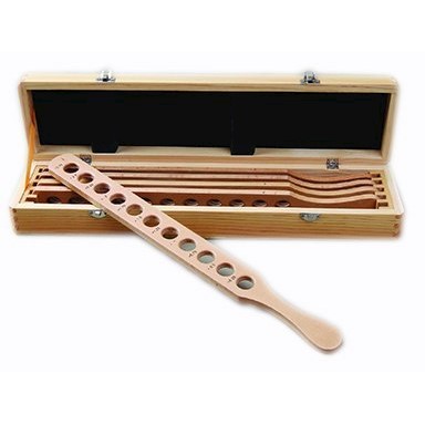Zestaw drewnianych linijek do skiaskopii, szczególnie przydatny w przypadku pacjentów nie współpracujących.