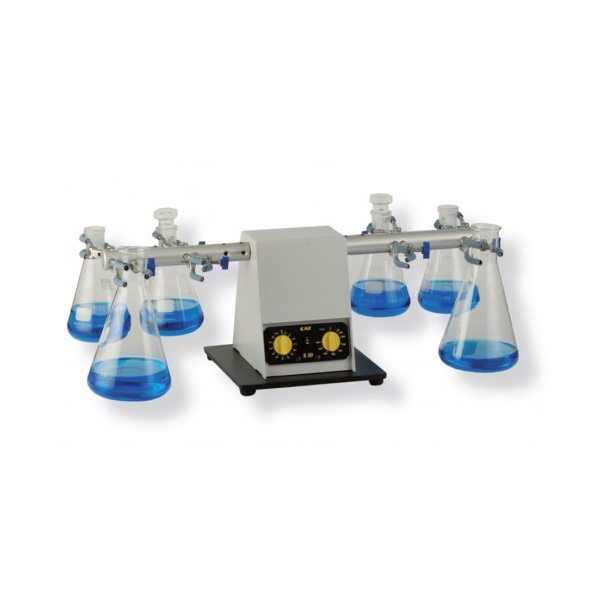Wstrząsarka o uchylnym ruchu ramienia, standardowo wyposażona w 8 uchwytów trójpalczastych do kolb Erlenmayera o pojemności do 500 ml. Urządzenie przystosowane jest do pracy o dużym obciążeniu: wszystkie przeguby osadzone na trwałych łożyskach kulkowych