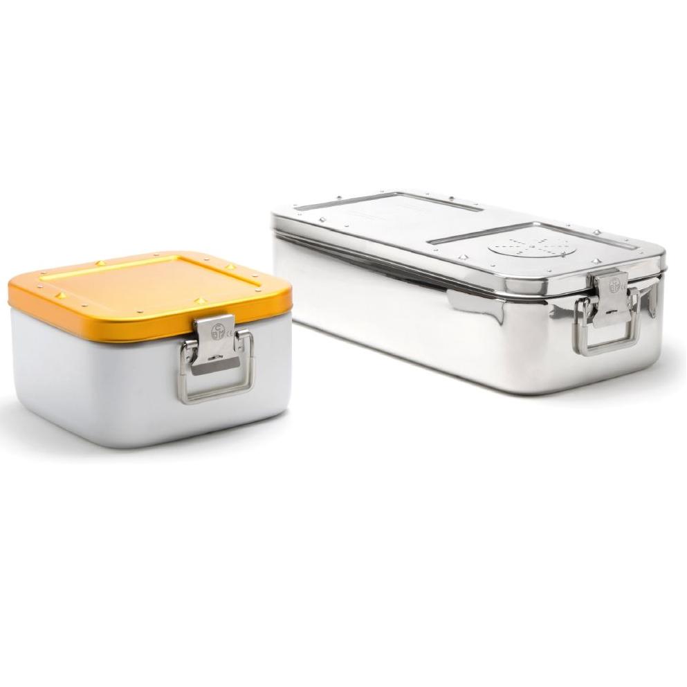 - Pojemniki sterylizacyjne z filtrem w pokrywie mogą być wykonane ze stali kwasoodpornej (AISI 304/ PN 0H18N9) lub aluminium (5005).