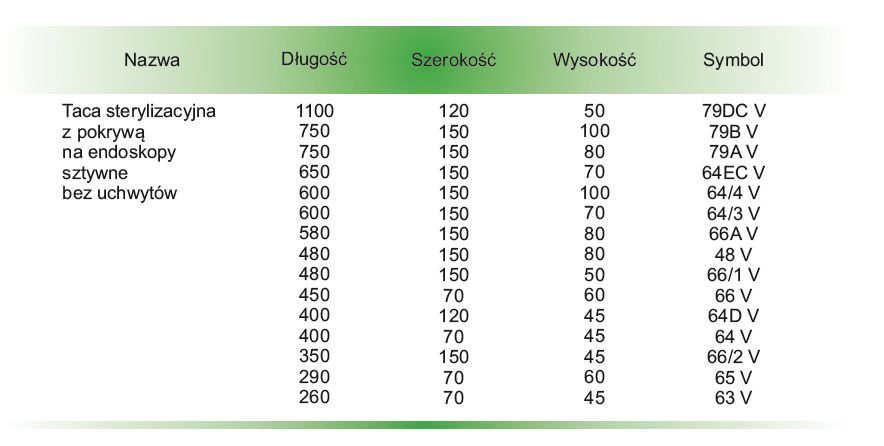 rozwoju środków transportu w nowoczesnych centralnych sterylizatorniach. Tace sterylizacyjne firmy CBM spełniają wymagania Dyrektywy o wyrobach medycznych. Tace są wykonane z blachy perforowanej ze stali kwasoodpornej (AISI 304 / PN 0H18N9). Stal kwasoodporna nie ulega deformacji ani nie zmienia swoich właściwości pod wpływem ciepła i pary wodnej. Posiada wysoką odporność mechaniczną, co zapewnia długi okres użytkowania tac. Perforacja blachy jest bardzo gęsta, zapewniając takie same warunki mycia jak na tacy z siatki drucianej.