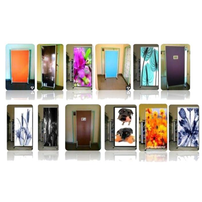 Parawana dwuskrzydłowy, pełny, bez szyby. Szerokość parawanu od 150 - 170 cm. Wykonany na ramię anodowej, wyposażonej w kółka.