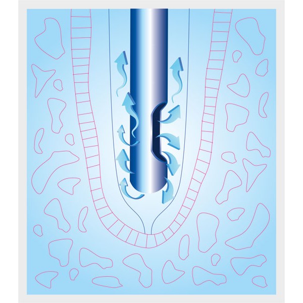- Odpowiednio dobrana wielkość i położenie bocznego otworu: eliminują możliwość przepchnięcia płynu płuczącego poza otwór wierzchołkowy; wymuszają turbulentny przepływ płynu w kanale, zapewniając doskonałe oczyszczenie; rozpraszają wypływający strumień płynu, dzięki czemu zwilżana jest stosunkowo duża powierzchnia;