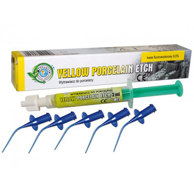 Wytrawiacz do porcelany YELLOW PORCELAIN ETCH (kwas fluorowodorowy w postaci żelu) i SILAN umożliwiają naprawę uzupełnień protetycznych w gabinecie, bezpośrednio w jamie ustnej pacjenta. Wytrawiacz stosuje się do wytrawiania porcelany przy naprawianiu uzupełnień protetycznych w jamie ustnej pacjenta, a także do wytrawiania porcelanowych licówek, koron lub wkładów (inlay) przed ich zacementowaniem.