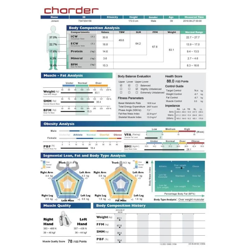 Profesjonalny medyczny analizator składu ciała Charder MA601 klasy klinicznej dostarcza wartości pomiarowe i dane, które są wynikiem badania z użyciem wielu częstotliwości. Oprogramowanie i podłączenie do komputera bezpłatne.