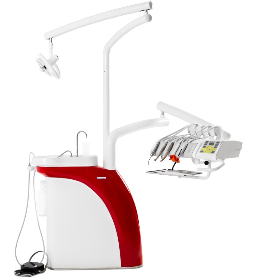 To co odróżnia go od wszystkich pozostałych to fakt, że występuje bez fotela. Jeżeli nasz dotychczasowy fotel może jeszcze długo pracować, bądź jest tak wygodny, że nie chcemy go wymieniać na żaden inny to jest to rozwiązanie dla nas. Unit musimy przytwierdzić na stałe do podłoża lub w przypadku barku możliwości ingerencji w podłogę zamontować na specjalnej płycie. Wszystkie przyłącza mediów są ukryte w podstawie kolumnowego bloku. Opcjonalnie można zamontować sekcję przyłączy w sąsiedztwie unitu. W kolumnie spluwaczki pomimo wizualnie smukłego kształtu jesteśmy w stanie zmieści kompresor marki ECOM.