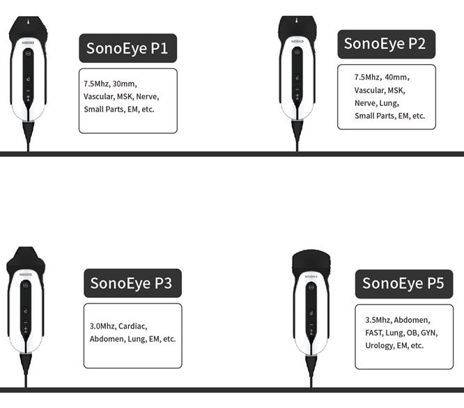Mieszczące się w dłoni urządzenie dostępne jest w różnych typach głowic, w zestawie znajduje się kabel łączący oraz aplikacja «SonoEye», licencja użytkownika i pokrowiec/walizka.