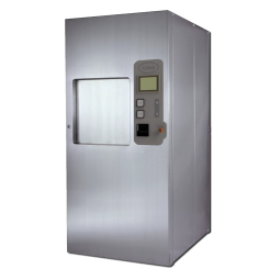 Urządzenie wyposażono w system próżniowy, który składa się z wysokowydajnej, jednostopniowej pompy próżniowej z pierścieniem cieczowym, która zapewnia szybkie usuwanie powietrza podczas etapu wstępnego próżni i lepsze suszenie podczas etapu po próżni. Pompa jest zainstalowana na specjalnych uchwytach antywibracyjnych, które zapobiegają hałasowi i wibracjom na konstrukcji urządzenia. Poprzez użycie impulsów pary / próżni podczas etapu wstępnego próżni, całe powietrze jest usuwane, aby zapewnić doskonałą przenikalność pary wodnej wewnątrz wsadu. Gorące opary z urządzenia są chłodzone poprzez rurowo-gniazdowy wymiennik ciepła przed wejściem do pompy próżniowej. System chłodzenia, zasilany przez wodę z sieci wodociągowej chroni pompę próżniową przed gorącymi oparami z komory.