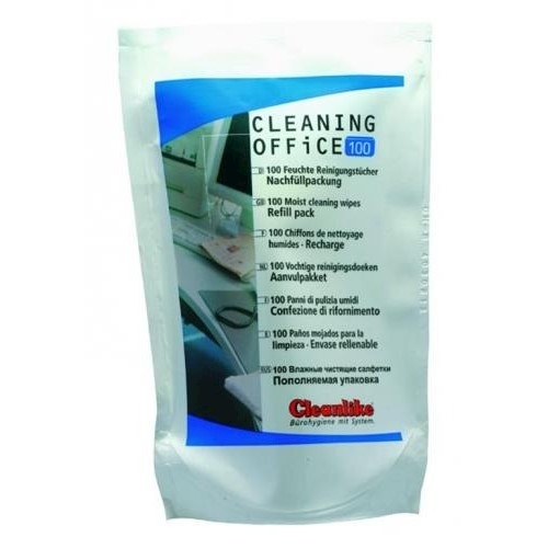 Nawilżone ściereczki z włókniny w opakowaniu ze szczelnym zamknięciem, które można wielokrotnie otwierać i zamykać. Odpowiednie do czyszczenia wyposażenia biurowego. Działają antystatycznie i dezynfekująco. Wymiary: 138 x 190 mm