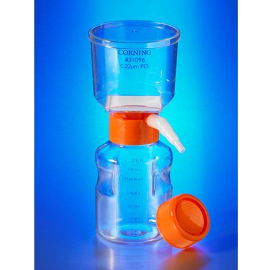 System filtracji próżniowej Corning składa się z polistyrenowego lejka filtrującego połączonego za pomocą adaptera pierścieniowego z wymienną polistyrenową butelką do przechowywania, z oddzielną sterylną nakrętką polietylenową. Butelki odbiorcze mają łatwe do uchwycenia boki dla lepszej obsługi. Aby zwiększyć przepustowość można zamówić dodatkowe butelki do przechowywania/odbiorcze firmy Corning.