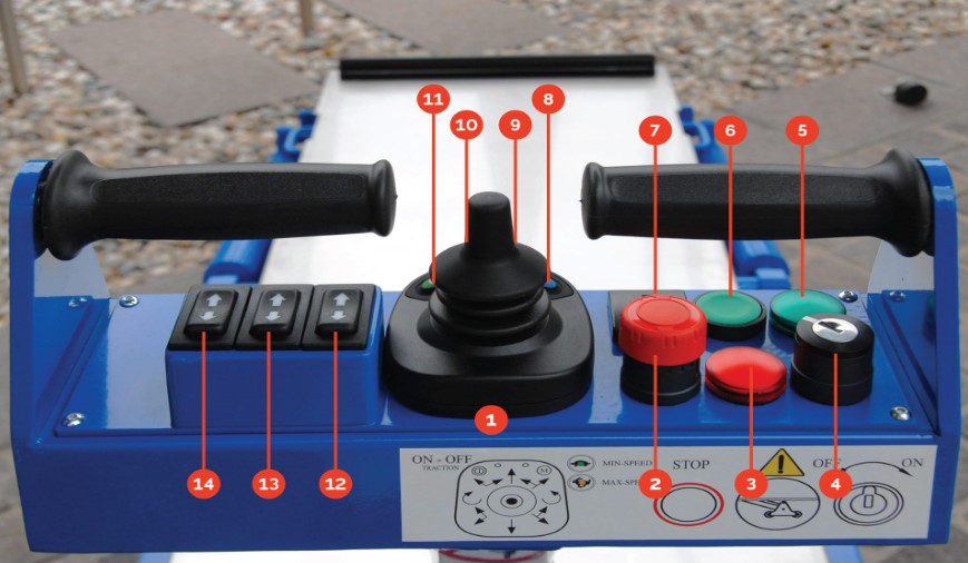 1. układ sterowania 2. Przycisk zatrzymania awaryjnego 3. System podnoszenia rolek z czerwoną diodą 4. Wejście na klucz 5. zielona dioda sygnalizująca uruchomienie PIANOPLAN 6.Przycisk do systemu podnoszenia rolek 7. Licznik roboczo godzin 8. przycisk do wyboru prędkości jazdy 9. Dioda sygnalizując prędkość jazdy oraz alarm.10. Lampka kontrolna do ładowania baterii. 11. Dioda sygnalizująca jazde 12. Przycisk sterujący ruchem platformy 13. Przycisk sterowania systemem podnoszenia rolek 14. Przycisk sterujący nachyleniem platformy (niedostępny w standardzie Pianoplan 600 J).