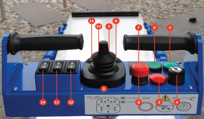 1. układ sterowania 2. Przycisk zatrzymania awaryjnego 3. System podnoszenia rolek z czerwoną diodą 4. Wejście na klucz 5. zielona dioda sygnalizująca uruchomienie PIANOPLAN 6.Przycisk do systemu podnoszenia rolek 7. Licznik roboczo godzin 8. przycisk do wyboru prędkości jazdy 9. Dioda sygnalizując prędkość jazdy oraz alarm.10. Lampka kontrolna do ładowania baterii. 11. Dioda sygnalizująca jazde 12. Przycisk sterujący ruchem platformy 13. Przycisk sterowania systemem podnoszenia rolek 14. Przycisk sterujący nachyleniem platformy (niedostępny w standardzie Pianoplan 600 J).