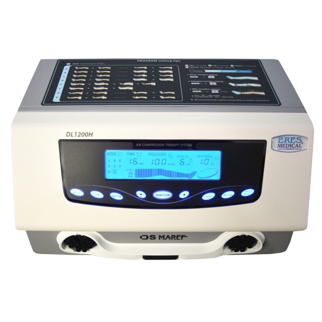 DL1200H to wysokiej klasy profesjonalne urządzenie do masażu limfatycznego do zastosowań w medycynie i odnowie biologicznej. Aparat obsługuje mankiety 12-komorowe z komorami zachodzącymi na siebie. Każda komora posiada własny zawór. Możliwa praca na 1 lub 2 mankietach jednocześnie. Wszystkie ustawienia aparatu widoczne są na wyświetlaczu dotykowym. Aparat posiada 8 programów masażu. Ciśnienie można ustawić osobno w każdej z 12 komór mankietu. Czas pozostawania powietrza w mankiecie ustawiany funkcją HOLD. Czas przerwy pomiędzy jednym napełnieniem mankietu a następnym ustawiany funkcją INTERVAL. Funkcja Zapis (Save) umożliwiająca zapis wartości ustawienia, aby była dostępna po następnym wyłączeniu i włączeniu urządzenia. Funkcja Reset służąca do przywrócenia domyślnej wartości.