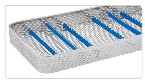 Zaciski mocujące są zaprojektowane tak, aby pomieścić delikatne instrumenty laboratoryjne do operacji skopowych w taki sposób, aby użytkownik mógł łatwo podnieść i odłożyć instrument podczas użytkowania oraz w celu bezpiecznego obchodzenia się z procesami sterylizacji i dezynfekcji. Zaciski są regulowane do instrumentów o dowolnym rozmiarze.