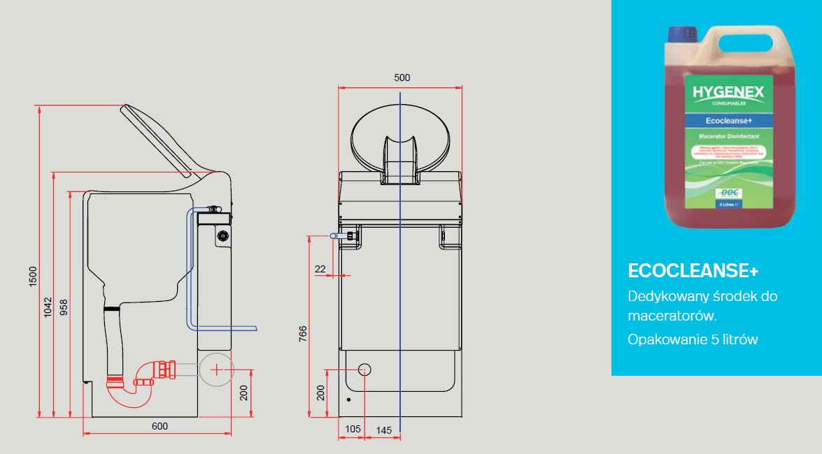 ULTIMA oferuje automatyczny system dezynfekcji i deodoryzacji całej komory maceratora. Komora jest spłukiwana wodą oraz płynem ECOCLEANSE+ pozostawiając komorę czystą i przyjemnie pachnącą.