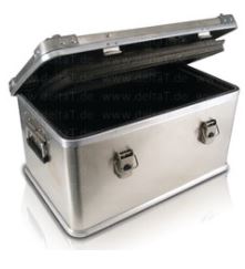 Aluminiowy pojemnik z wewnętrzną wykładziną z EPP, dwa uchwyty po bokach, jeden na górze, dwa zamki, schowki na dokumenty, wszystkie elementy mocowane nitami.