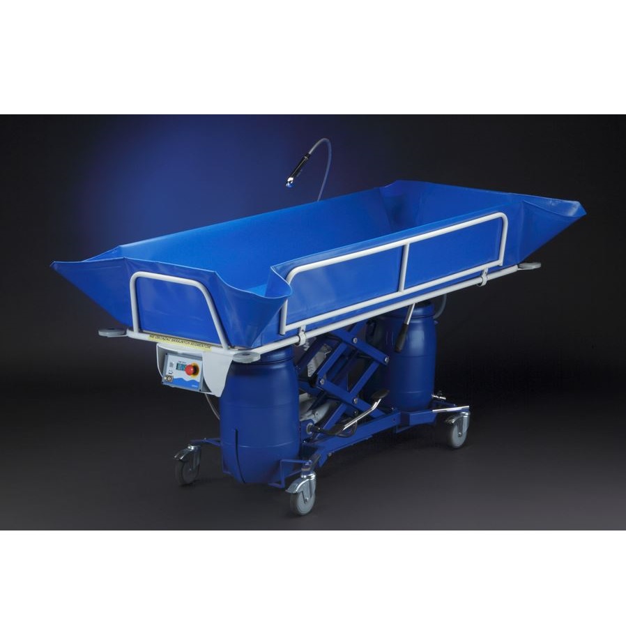 Wózek kąpielowy posiada regulowaną wysokość leża-wanienki, co ułatwia podejmowanie pacjenta z łóżka, a personelowi zapewnia wygodną, ergonomiczną pozycję przy obsłudze.