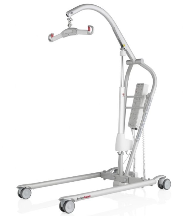 - Mobilny, kompaktowy i relatywnie wąski podnośnik pacjenta wykonany ze stali malowanej proszkowo.
