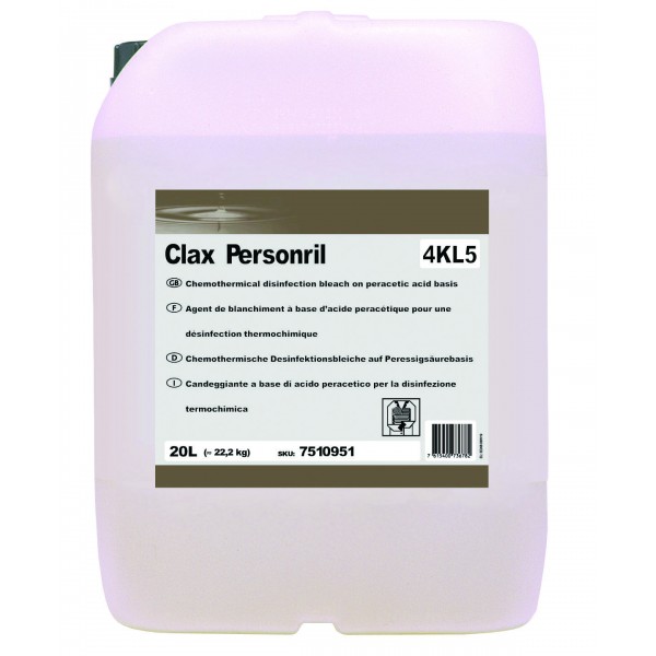 Clax Personril 4KL5 jest jednym ze specjalistycznych preparatów piorących linii CLAX, przeznaczonej wyłącznie do profesjonalnego stosowania. Clax Personril 4KL5 stanowi specjalnie stabilizowaną mieszaninę złożoną z kwasu nadoctowego (ok. 5%), kwasu octowego, nadtlenku wodoru (ok. 25%) i stabilizatorów, wspomagającą usuwanie plam w procesie prania. Preparat ponadto działa wybielająco na bieliznę białą, minimalizuje utratę kolorów tkanin barwnych oraz dezynfekuje praną bieliznę. W przeciwieństwie do chloru jest bezpieczny dla większości włókien, ponieważ nie działa destrukcyjnie na celulozę. Polecany jest szczególnie do prania tkanin, które powinny być prane w niskich temperaturach (40-70ºC). Preparat może być stosowany do wszystkich rodzajów tkanin (zarówno białych, jak i kolorowych), z wyjątkiem wełnianych i nylonowych.