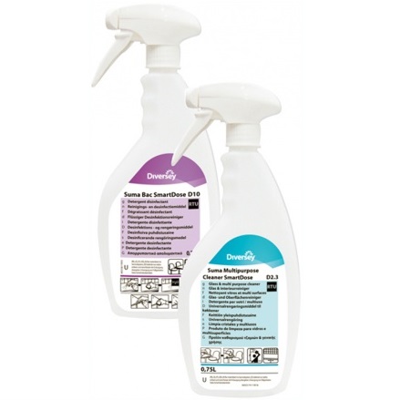Zestaw butelek ze spryskiwaczem 750 ml do Suma D2.3 Smart Dose oraz D10 Smart Dose z naklejkami.