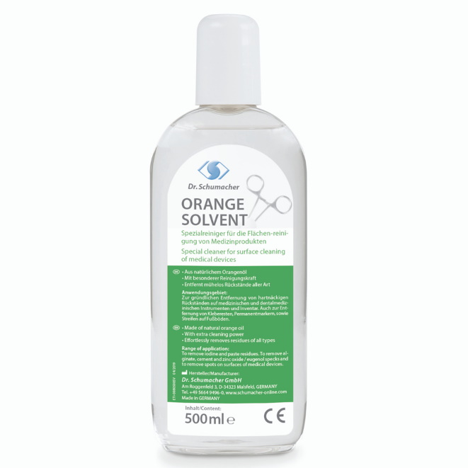 Orange Solvent jest gotowym do użytku roztworem myjącym do gruntownego usuwania resztek alginianu i cementu oraz plam z cynku i eugenolu na wyposażeniu, narzędziach. Oszczędny w stosowaniu.